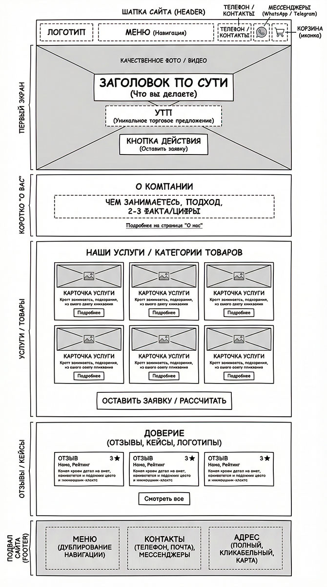 | Подвал (footer) | Дублировать важное и закрыть вопросы | Меню + контакты + адрес + мессенджеры, адрес кликабельный, карта | В подвале пусто или только копирайт — человек долистал и не понял, как связаться |